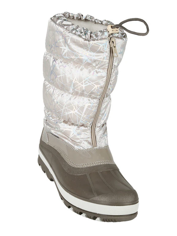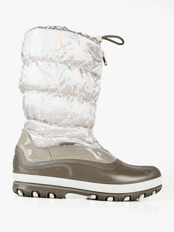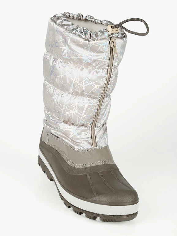 Stivali doposci da donna con tomaia in tessuto impermeabile e puntale in gomma, cerniera sul davanti e coulisse regolabile sul gambale, interno con imbottitura calda di pelo, suola in gomma antiscivolo