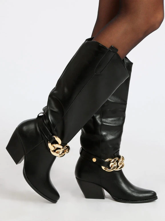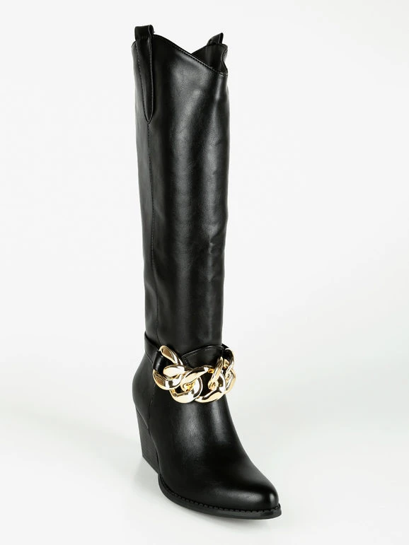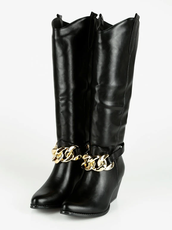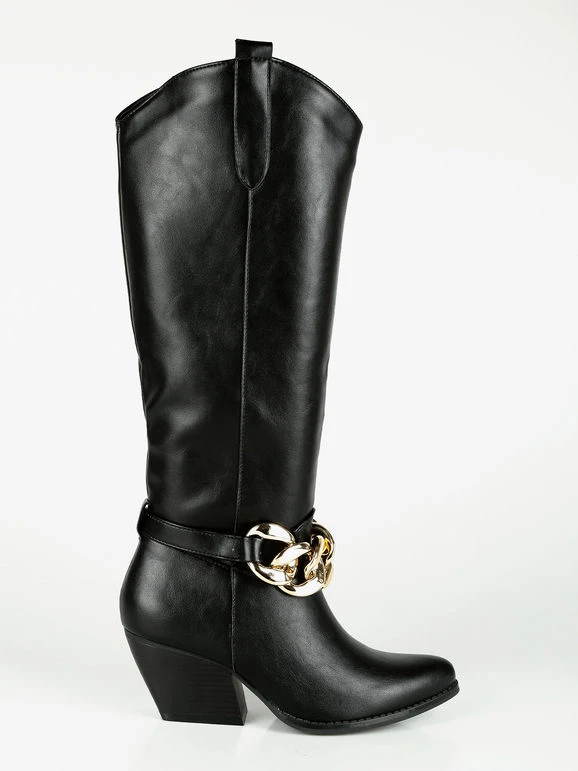 Stivali donna modello camperos. con tomaia in ecopelle, interno imbottito, cinturino decorativo con catena, suola in gomma