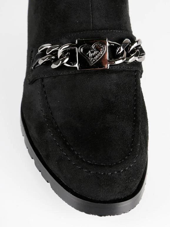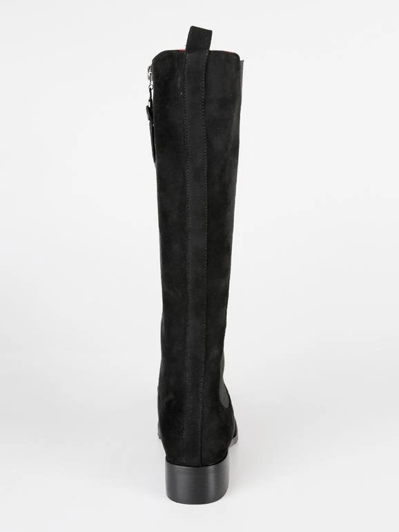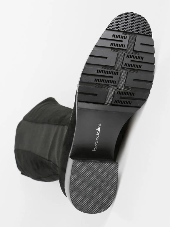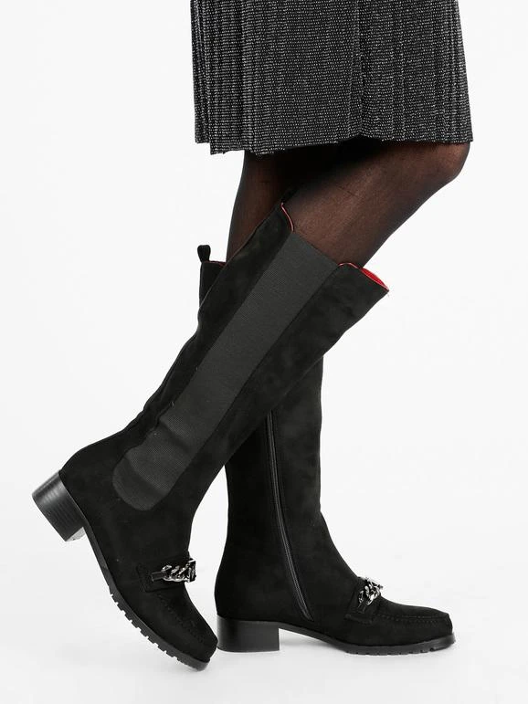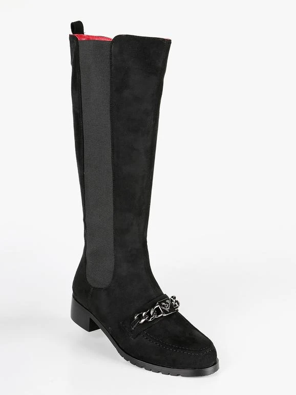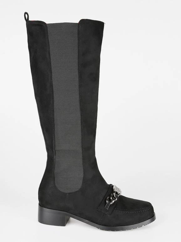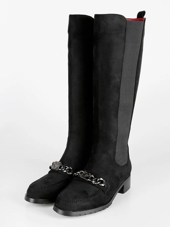 Tomaia in tessuto effetto scamosciato, chiusura con cerniera su lato interno, banda elastica su lato esterno, catena in metallo con marchio sul puntale, interno rivestito in caldo tessuto simile al pile, soletta interna in pelle, suola antiscivolo, tacco alto 4 cm, gambale alto 37,5 cm