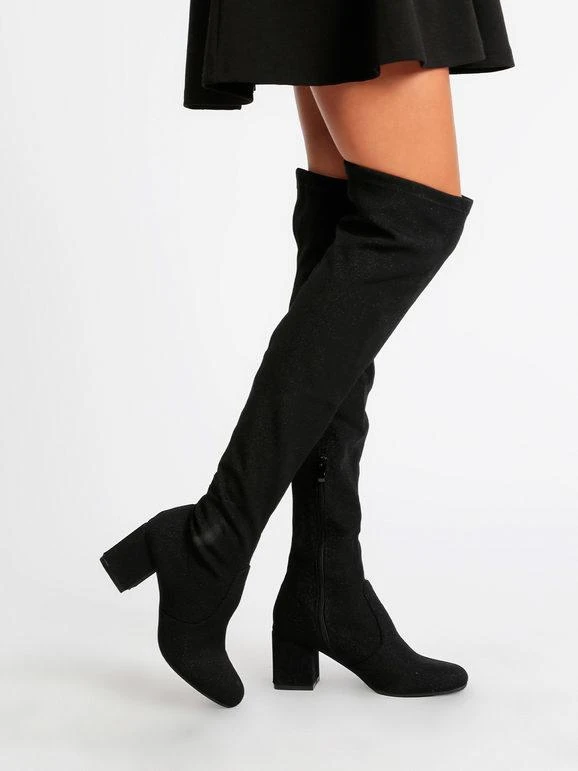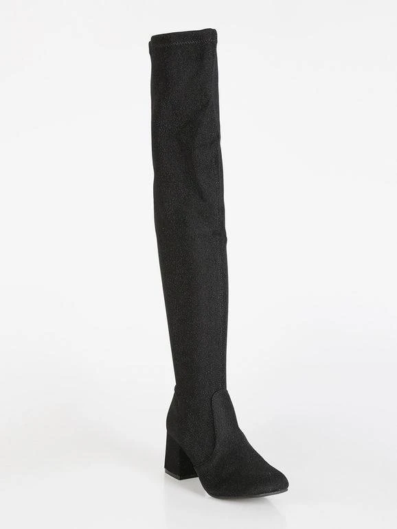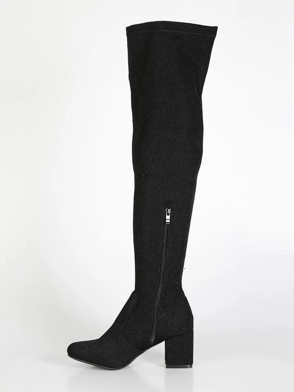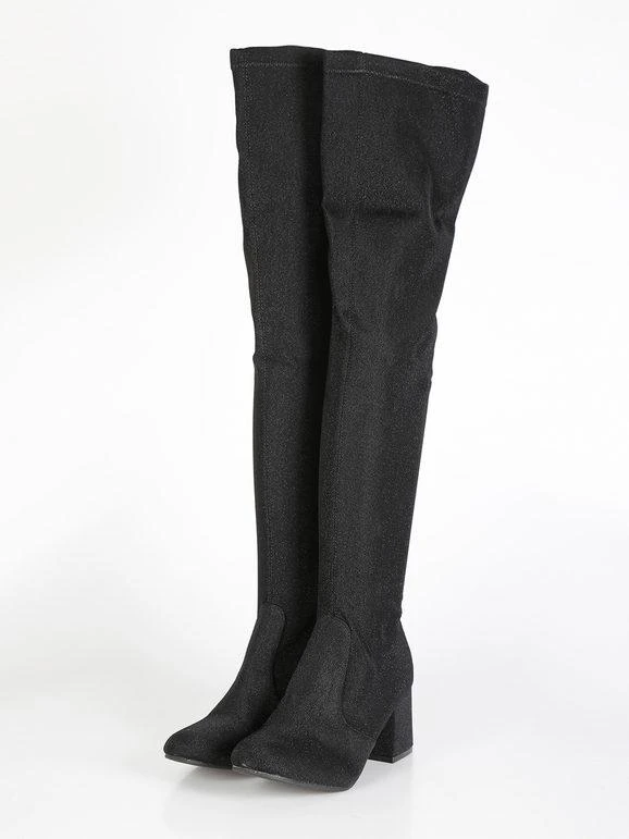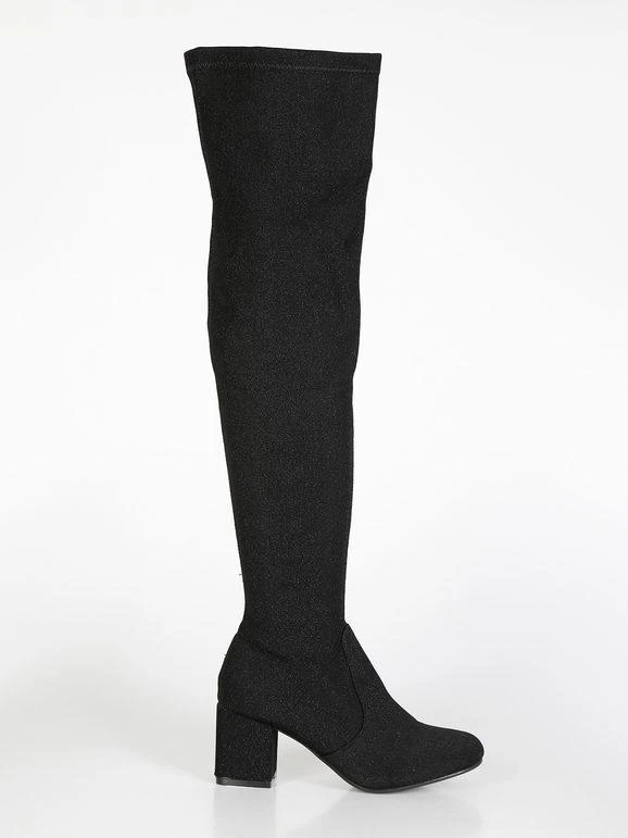 Stivali alti in tessuto con lurex, tomaia rinforzata sul collo del piede, tacco anch’esso in tessuto con lurex, cerniera fino a metà gamba per agevolare la calzata. Ideali per la sera o per un evento elegante in un look total black apportano dettaglio luce, ti consigliamo di abbinarli ad una pochette con strass della nostra selezione borse.