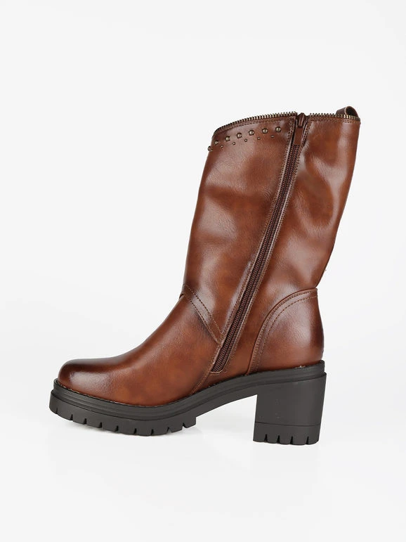 Tomaia in ecopelle,chiusura a portafoglio con fibbie all’esterno rende il gambale assimmetrico, interno foderato, cerniera su lato interno, tacco di 7,5cm. Ideali da abbinare con jeans stretti per esaltarne la forma, suola a carroarmato, borchie decorative su parte alta.
