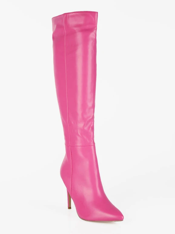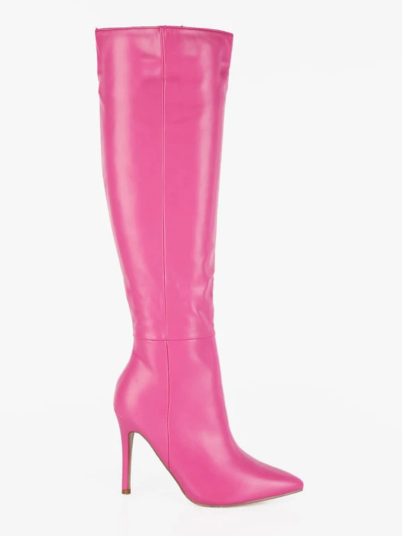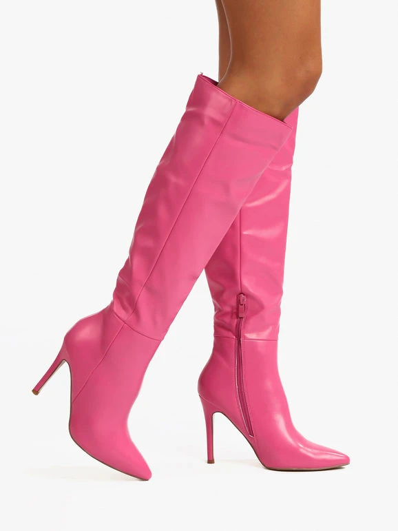Stivali donna con tomaia in ecopelle, interno in ecopelle, tacco alto 11 cm, suola in gomma, chiusura zip su lato interno.