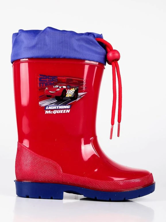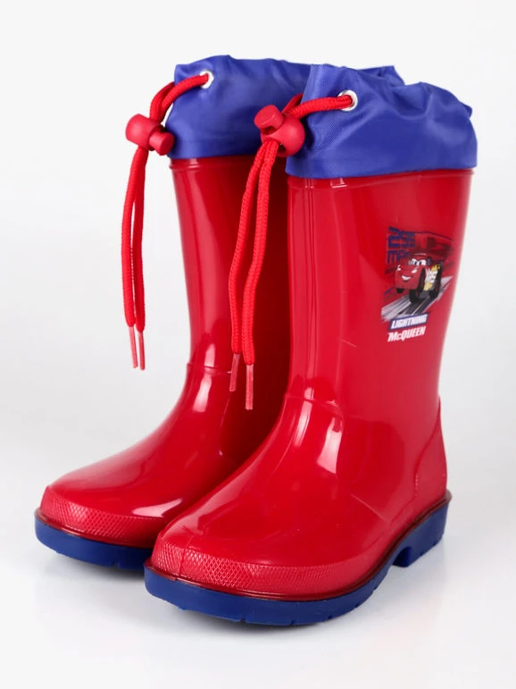 Stivali da bambino per la pioggia, con tomaia in gomma, finale del gambale in tessuto idrorepellente con coulisse regolabile, suola in gomma antiscivolo.