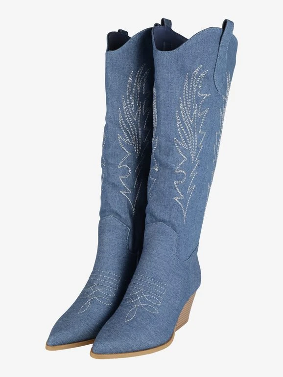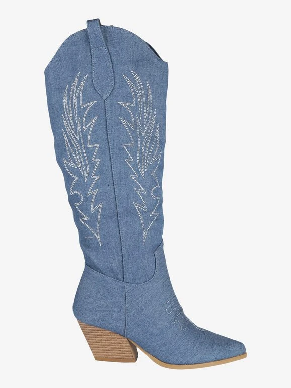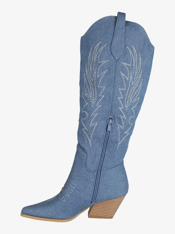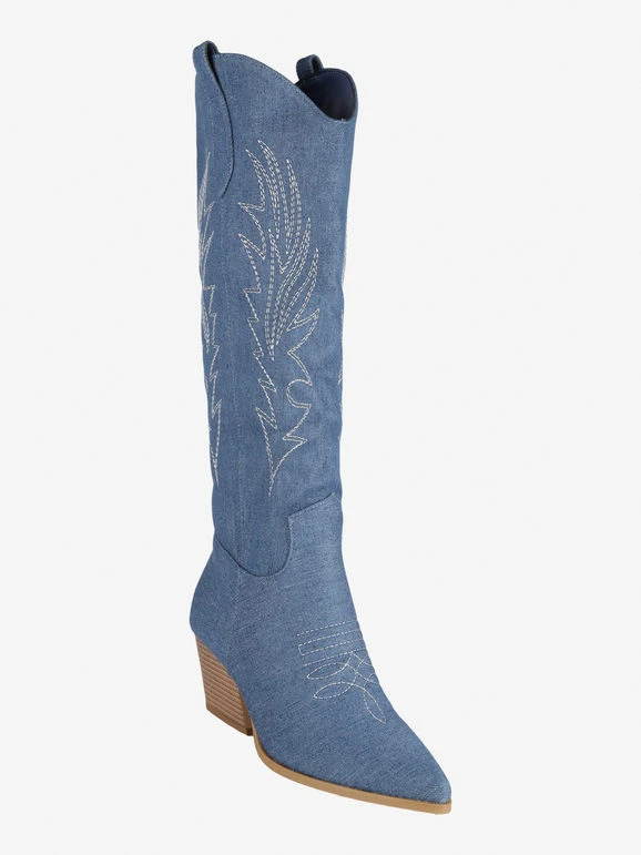 Stivali da donna a punta, modello texano, tomaia in tessuto effetto jeans, trama lavorata con cuciture decorative, mezza zip laterale nella parte interna per facilitare la calzata, interno foderato in tessuto, soletta interna in ecopelle, tacco alto 6 cm, suola in gomma antiscivolo.