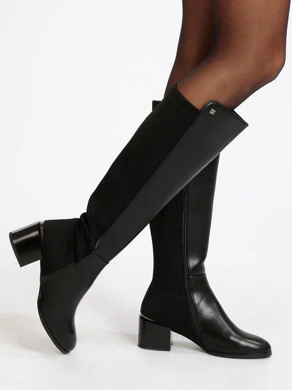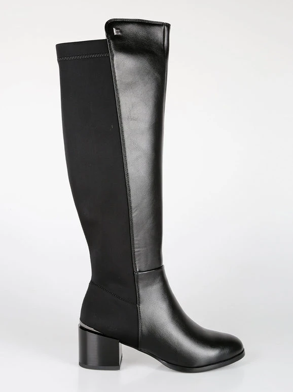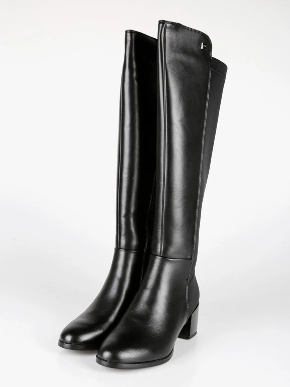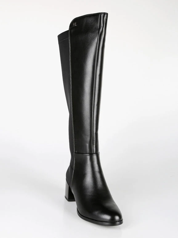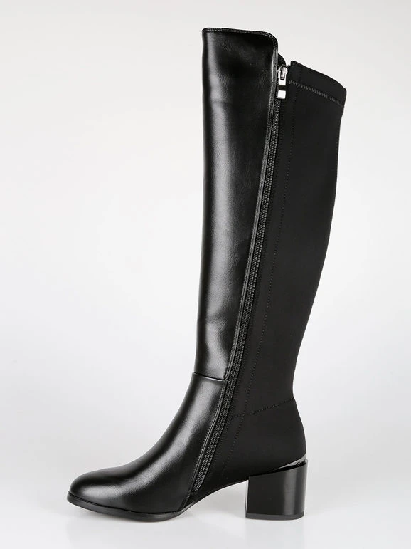 Stivali donna con tomaia in ecopelle sul davanti e tessuto elastico sul retro, chiusura con cerniera sul lato interno, plantare in pelle, suola in gomma antiscivolo.