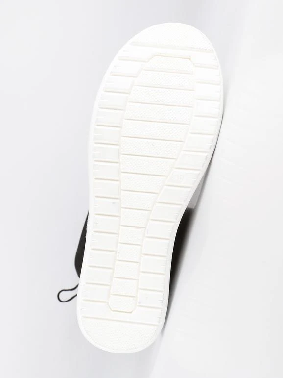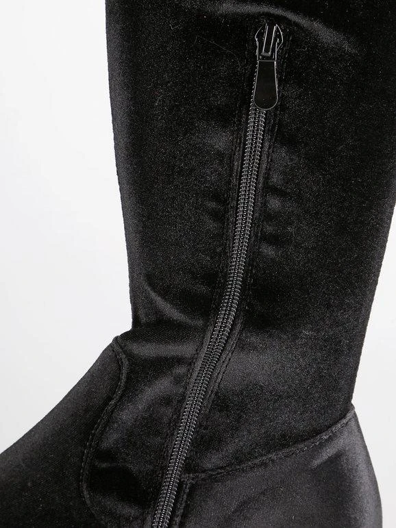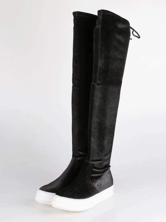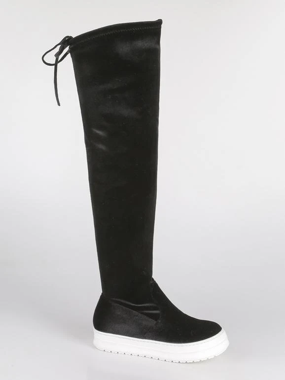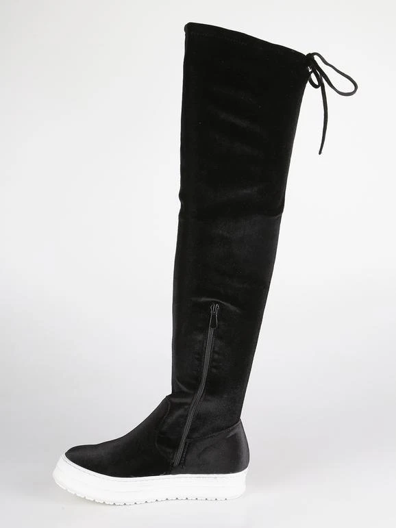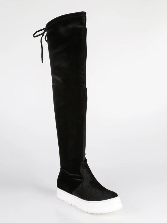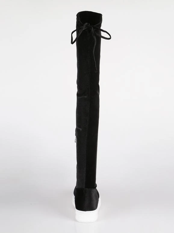 Tomaia in tessuto effetto ciniglia, mezza zip per chiusura su lato interno, lacci per fiocco su parte alta, cuciture a vista, platform alto 3,5, gambale alto 55 cm