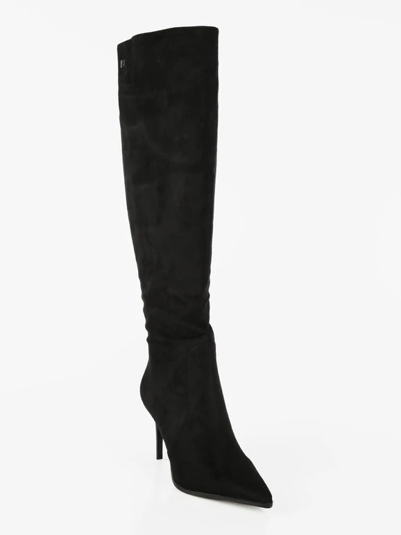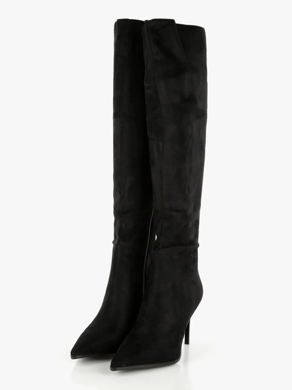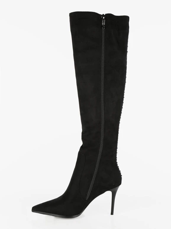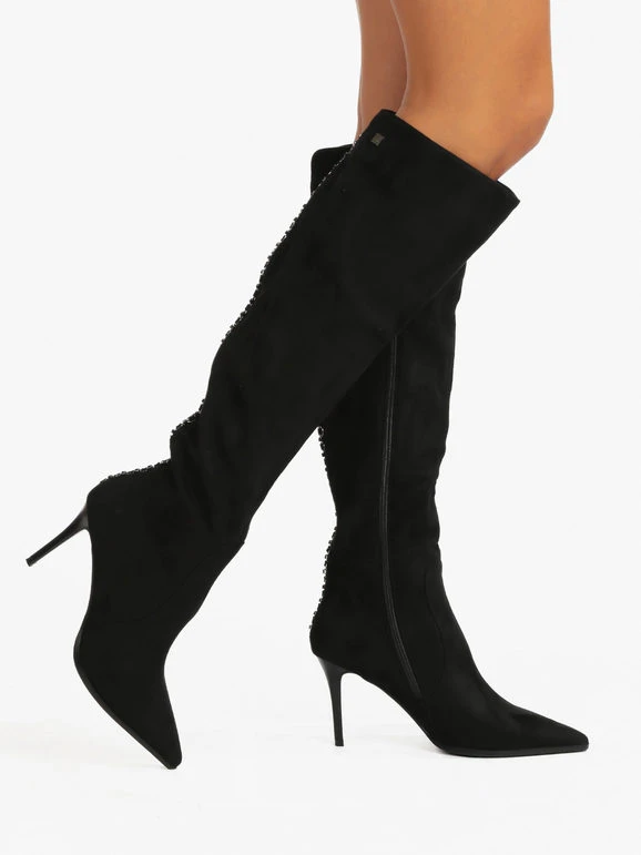 Stivali alti da donna in tessuto scamoscaito, tacco a spillo, chiusura con cerniera completa sul lato interno, parte posteriore decorata con strass, interno in tessuto scamosciato, suola antiscivolo