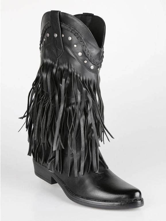 Tomaia in ecopelle con frange e piccole borchie di decoro, modello camperos texani, interno in tessuto sintetico con soletta in ecopelle. Nel N.38 la soletta interna è di 24 cm circa