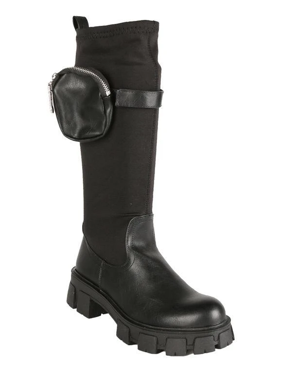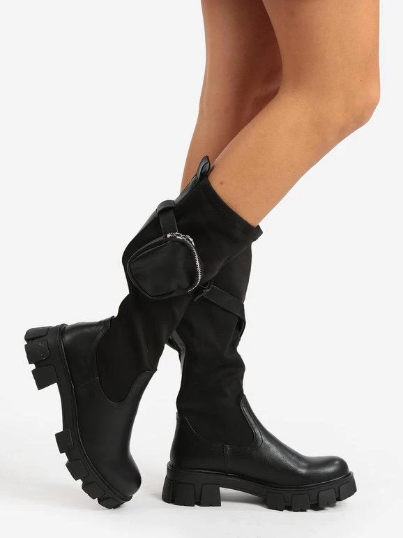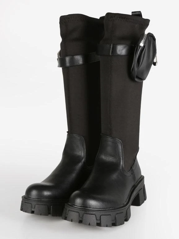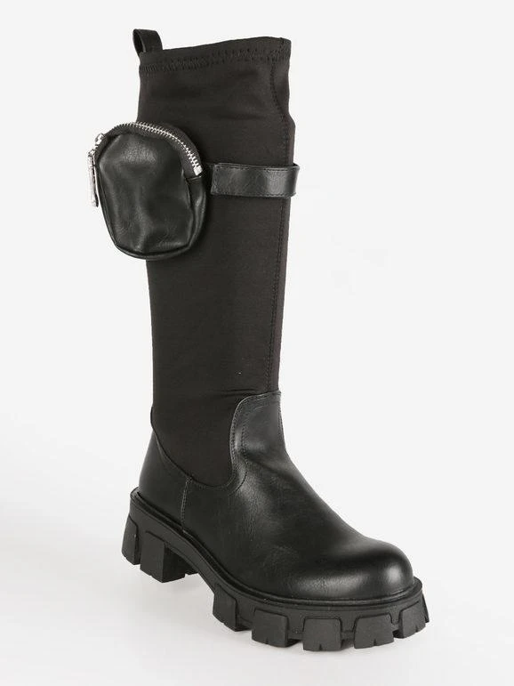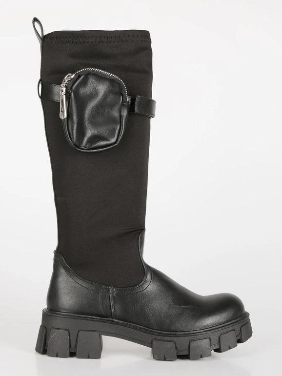 Tomaia in ecopelle e tessuto sintetico aderente, taschino con zip, removibile, suola a carraramato in gomma rinforzata, plateau in gomma alto 3 cm. Nel N.38 la soletta interna è di 24.5 cm circa