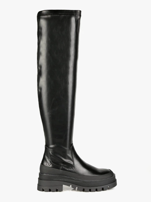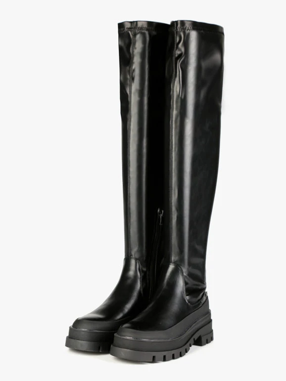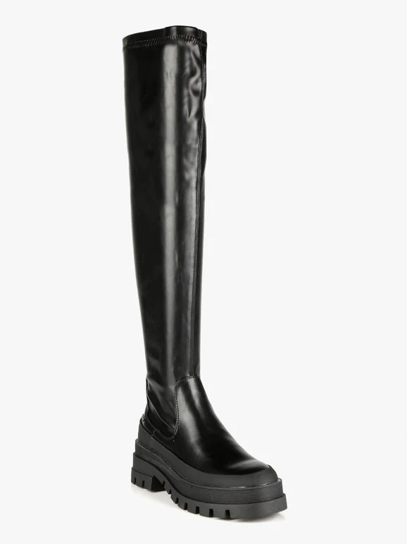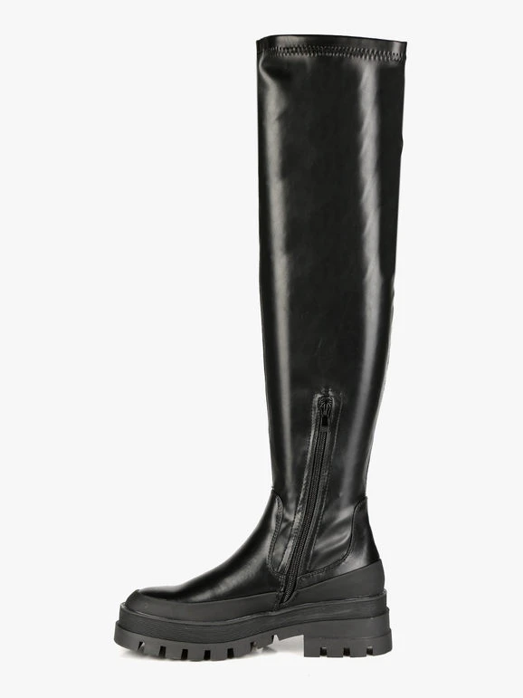 Stivali da donna, modello cuissardes, tomaia in morbida ecopelle, mezza zip sul lato interno, gambale morbido, platform alta 5,5 cm, interno in tessuto, suola a carroarmato antiscivolo.