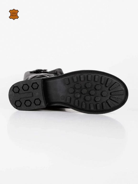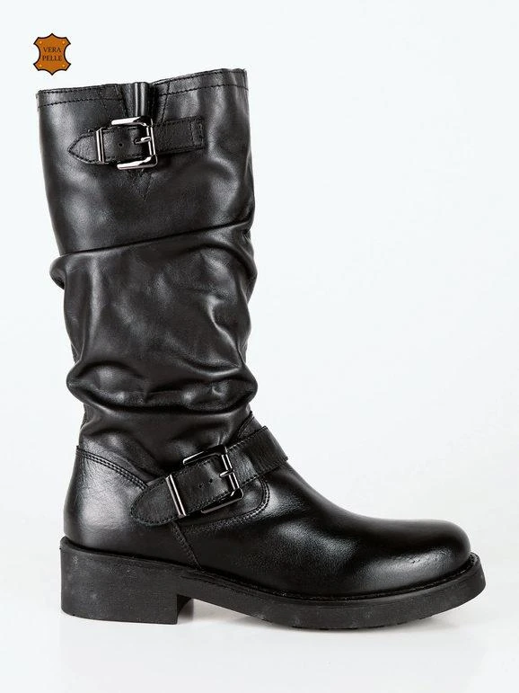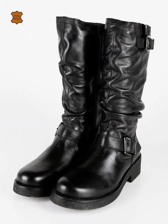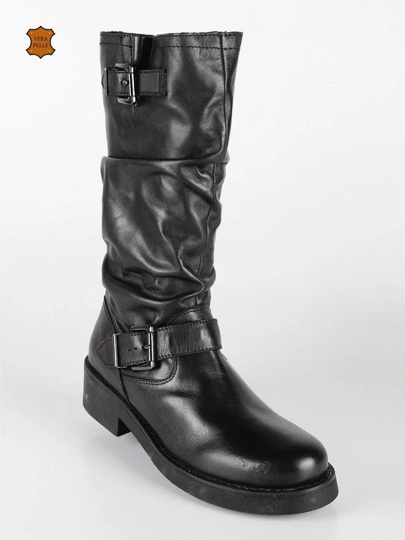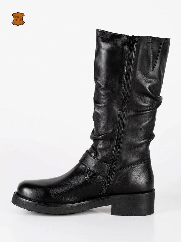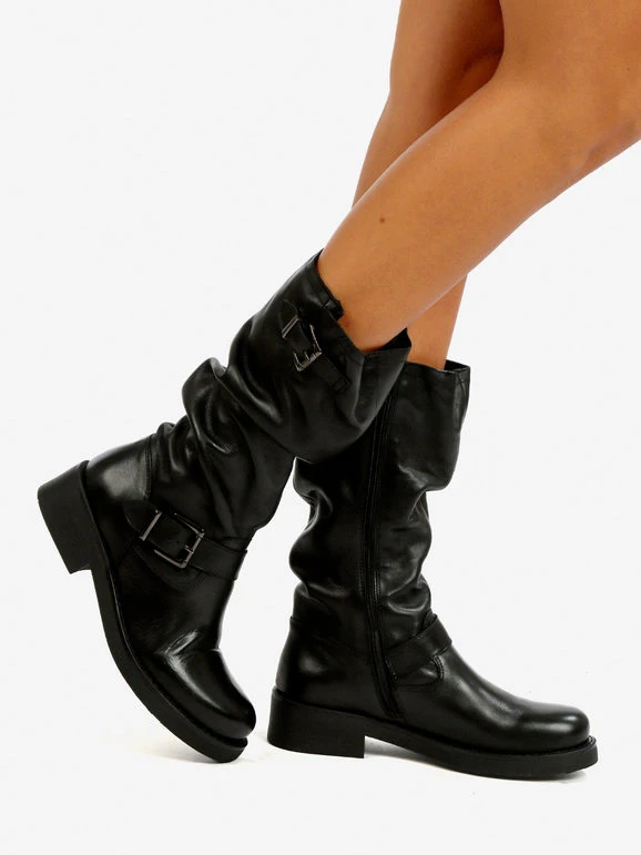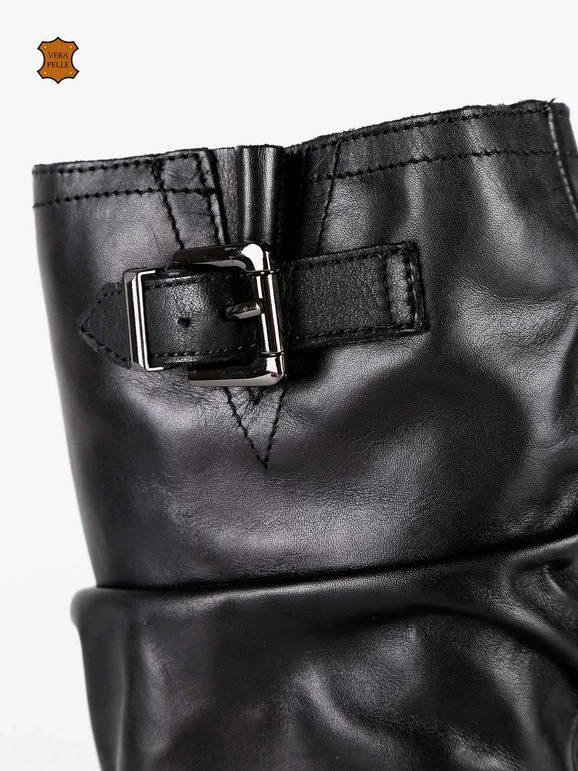 Tomaia in pelle liscia semilucida effetto stropicciato, cerniera di chiusura sul lato interno, soletta interna in pelle, suola in gomma antiscivolo, fibbie di bellezza sul lato esterno, tacco largo alto 4 cm, altezza gambale 28 cm. Nel N.38 la soletta interna è di 23.5 cm circa
