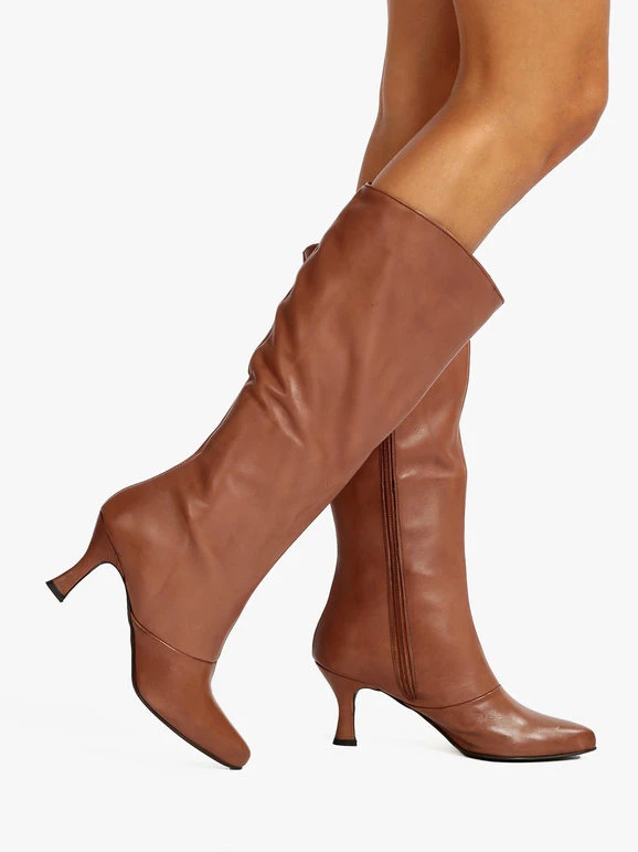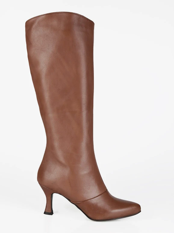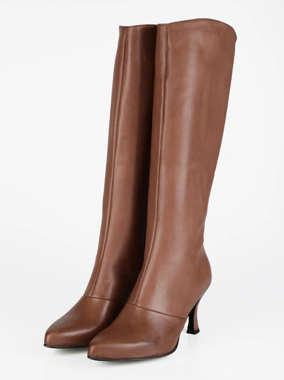 Stivali donna a punta con tomaia in pelle, interno in pelle, chiusura con zip sul lato interno, suola in gomma con tacco a rocchetto alto 7.5 cm.