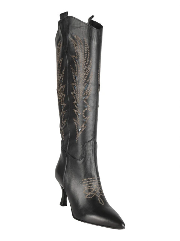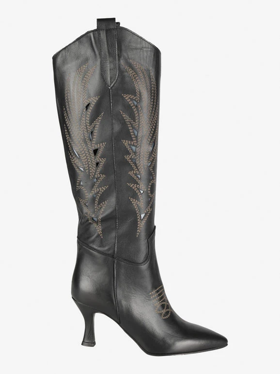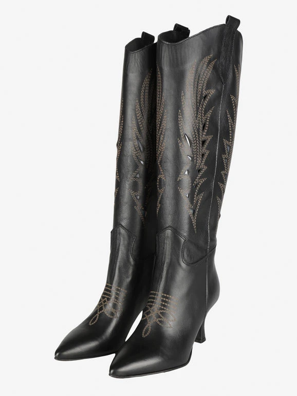Stivali donna a punta, tomaia in pelle traforata sul gambale, cuciture a vista con ricami decorativi in contrasto colore, interno in tessuto, tacco alto 7 cm, suola antiscivolo.