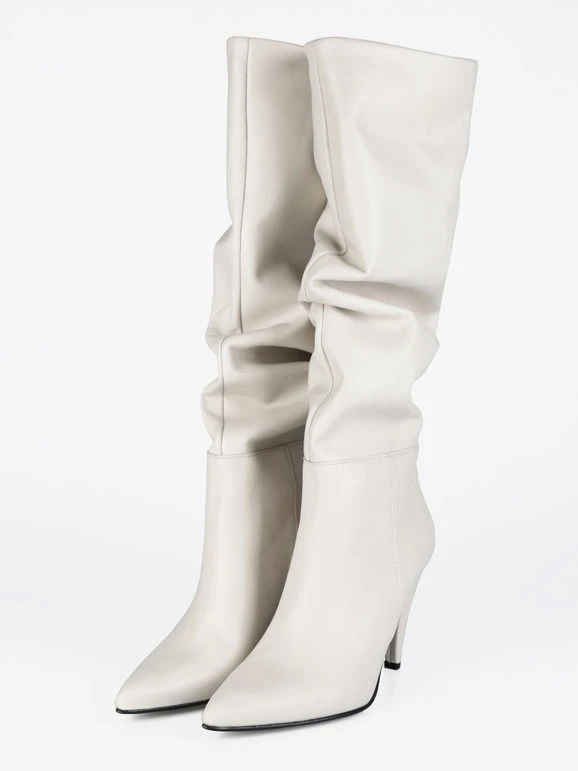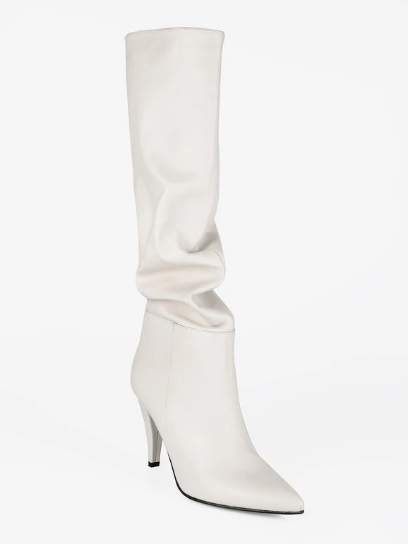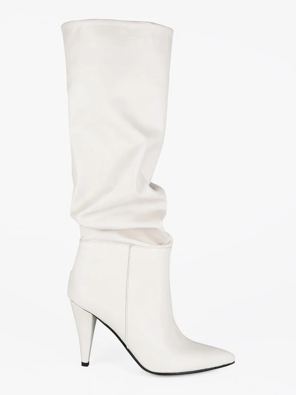 Stivali a punta con tomaia in pelle, interno in pelle, suola in gomma resistente, tacco a rocchetto, cuciture a vista, gambale arricciato.
