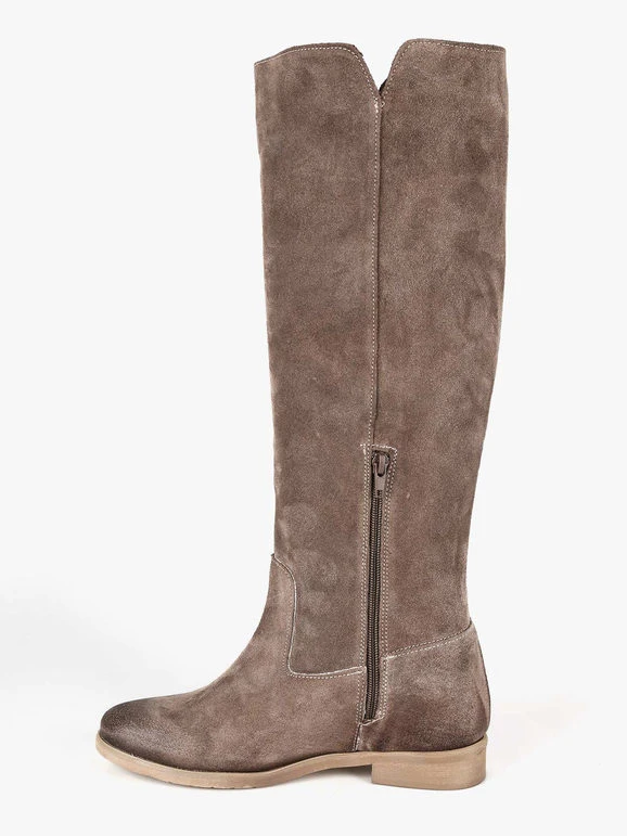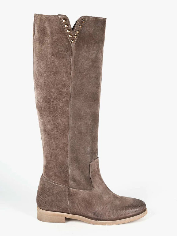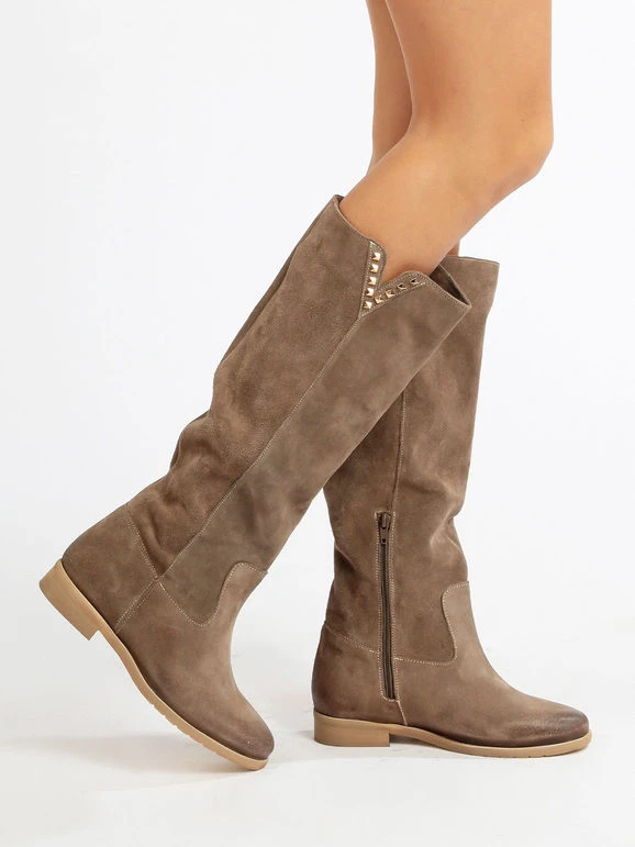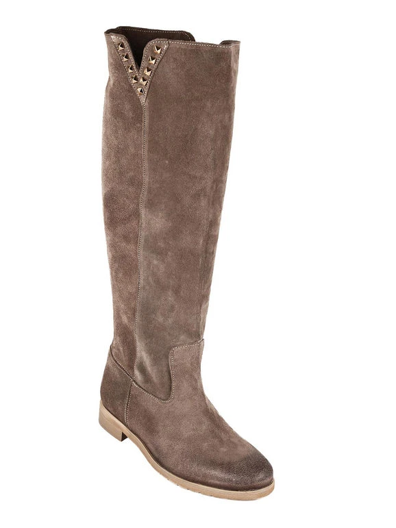 Stivali donna con tomaia in pelle, borchie decorative, interno scamosciato, mezza zip sul lato interno, suola in gomma.