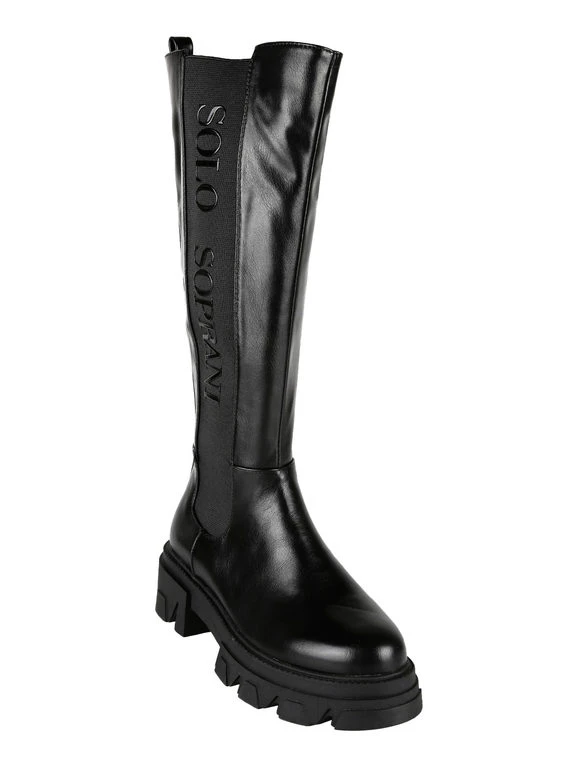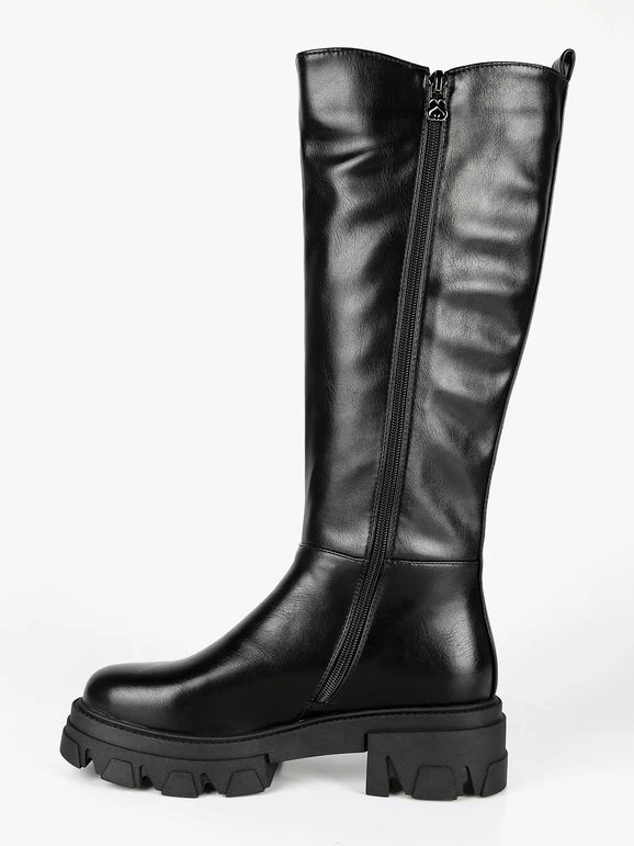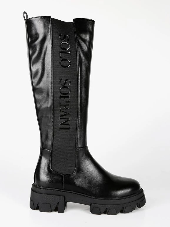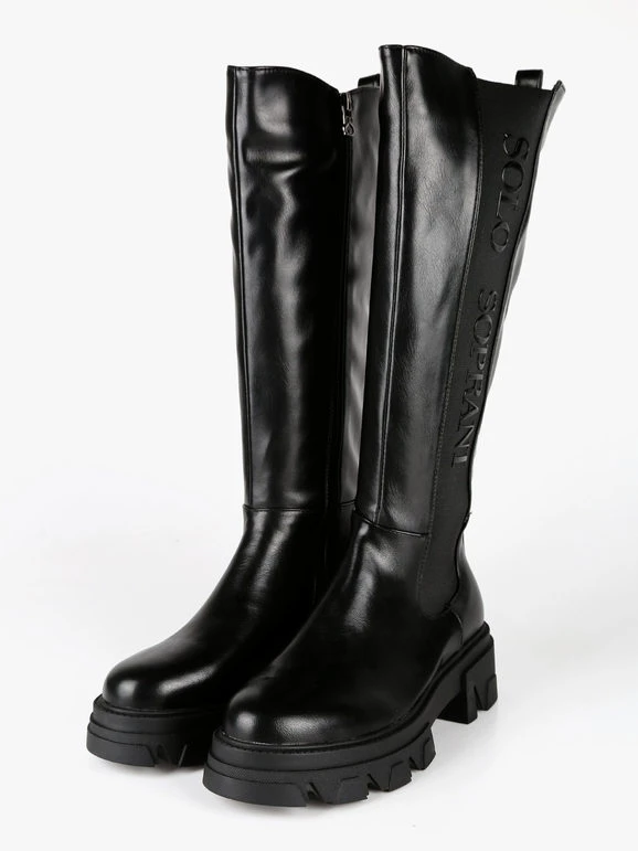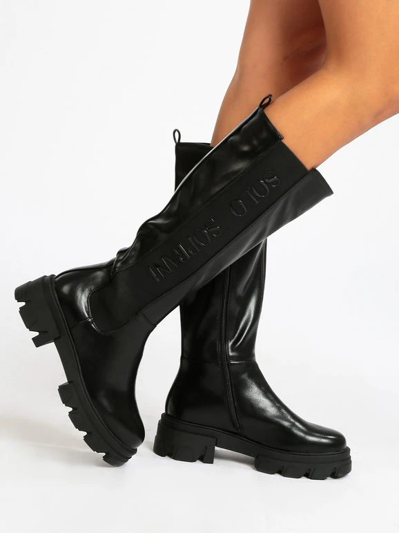 Stivali donna con tomaia in ecopelle, cerniera di chiusura sul lato interno e banda elastica con stampa marchio in rilievo, interno in finissimo pile, plateau alto 3cm, suola in gomma.