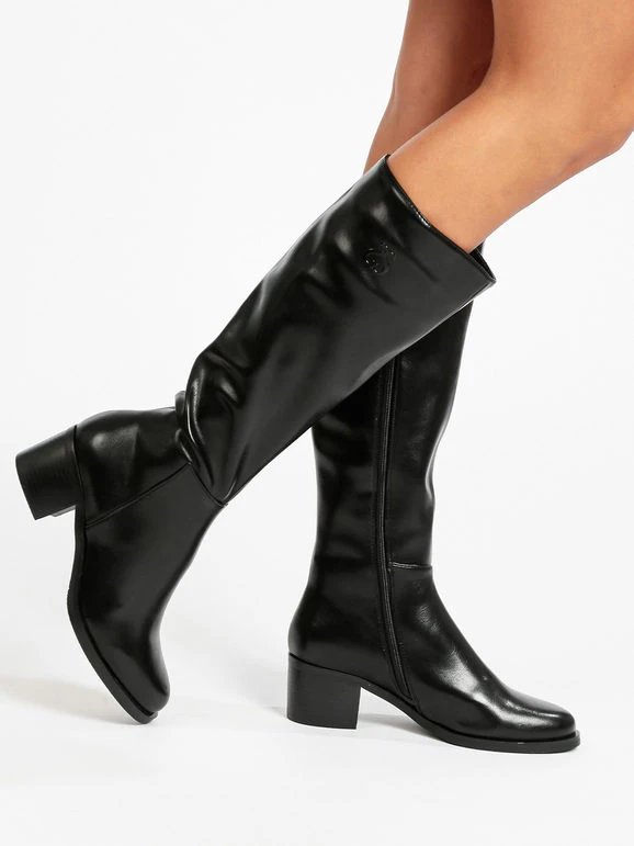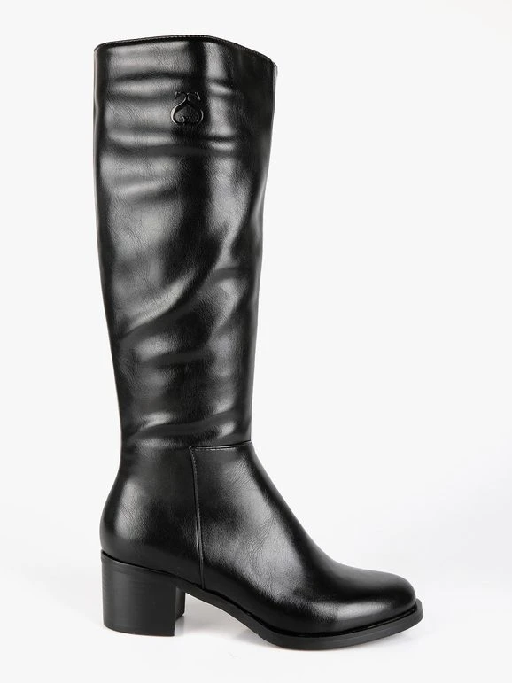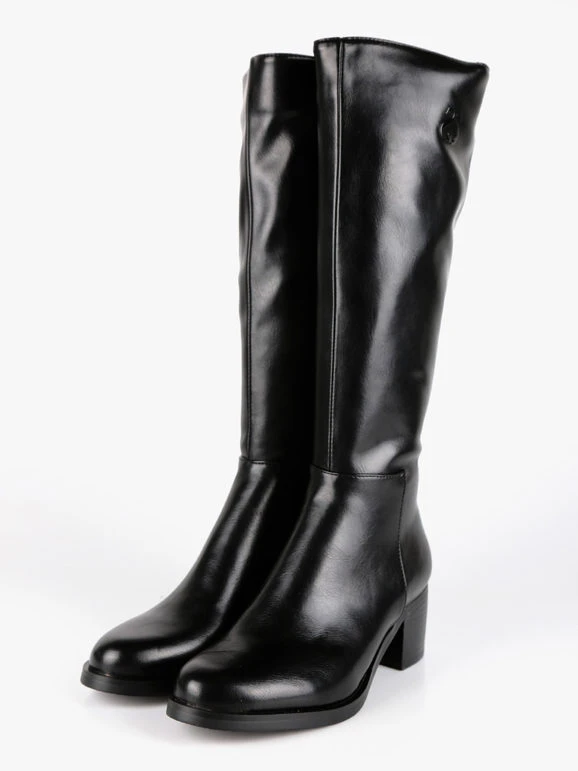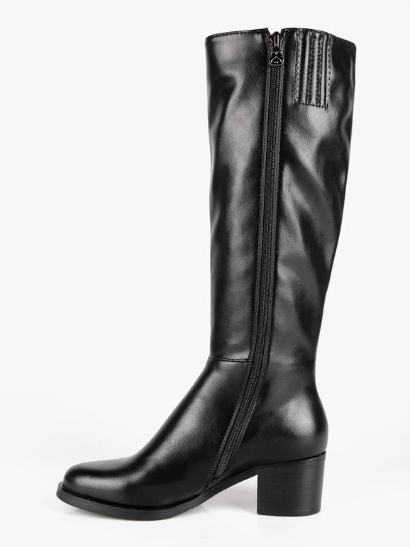 Stivali donna con tomaia in morbida ecopelle, cuciture a vista, zip laterale per facilitare la calzata, interno in caldo e morbido tessuto, tacco alto 5 cm, suola in gomma antiscivolo.