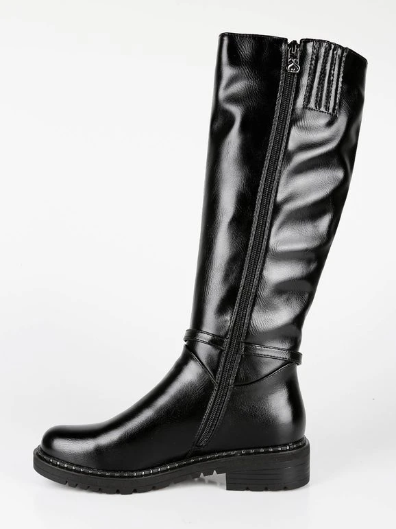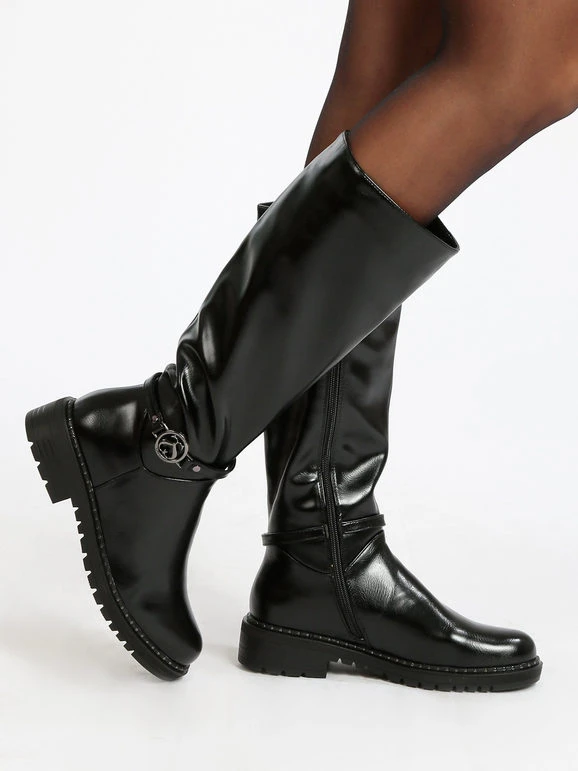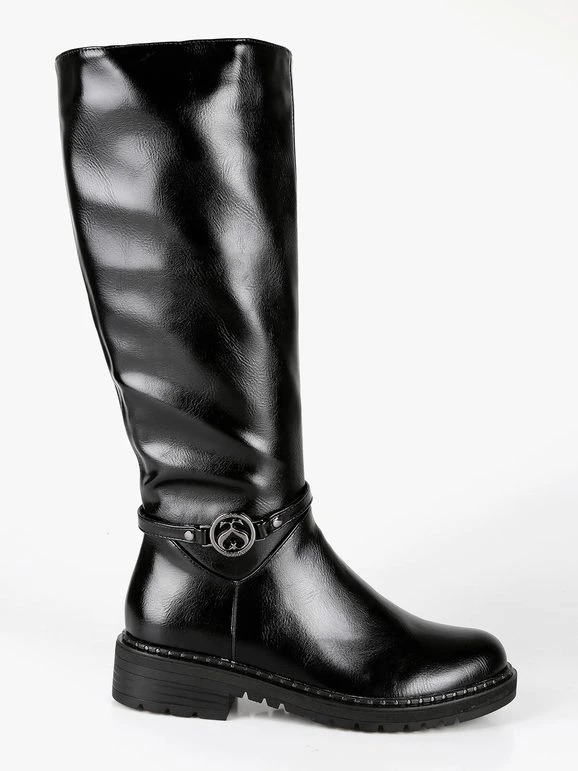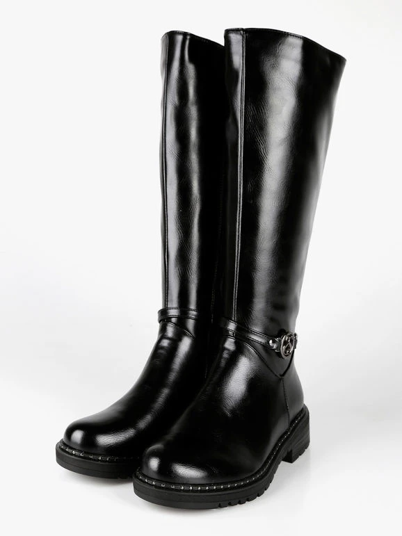 Stivali donna con tomaia in ecopelle, cerniera di chiusura sul lato interno, interno in finissimo pile, cinturino decorativo con inserto in acciaio, suola in gomma.