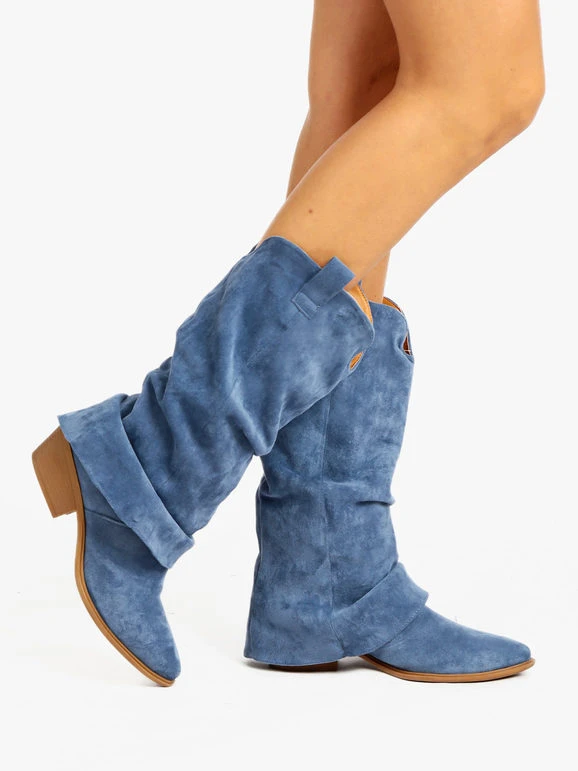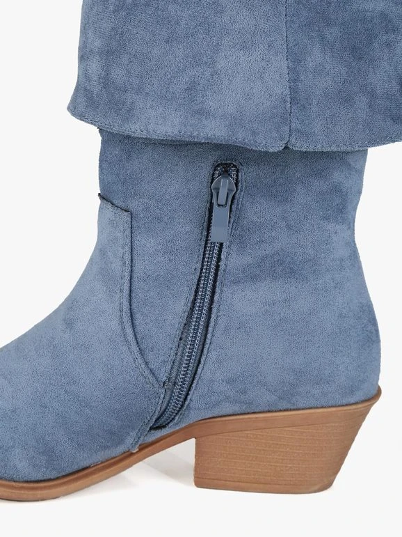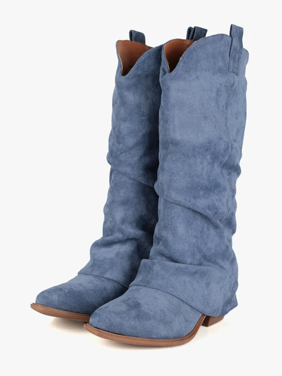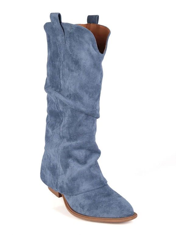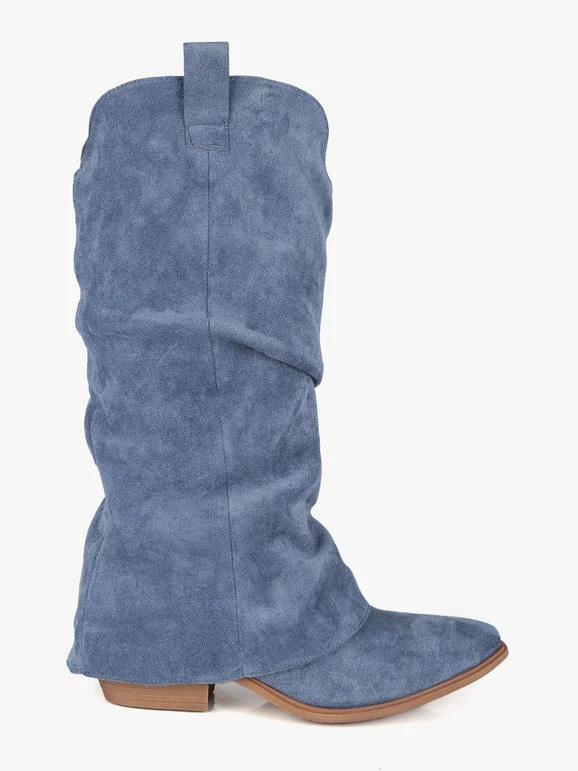 Stivale donna a punta, tomaia in tessuto scamosciato, grande risvolto morbido fino al tacco, mezza zip al di sotto del risvolto per facilitare la calzata, interno in tessuto, suola in gomma antiscivolo.