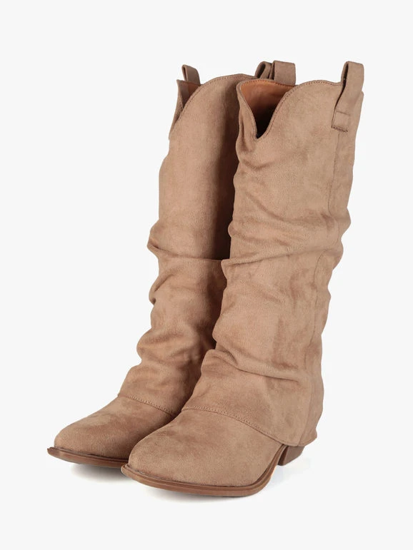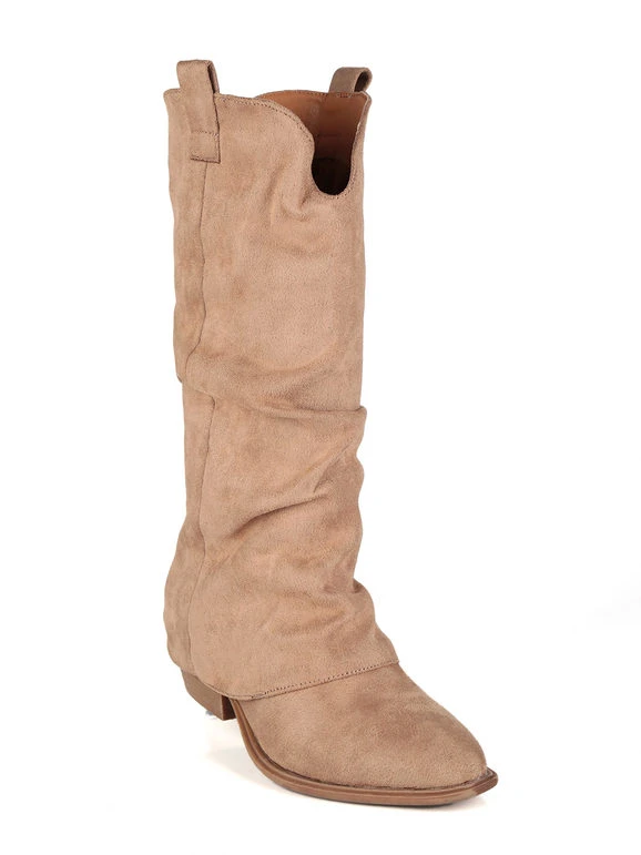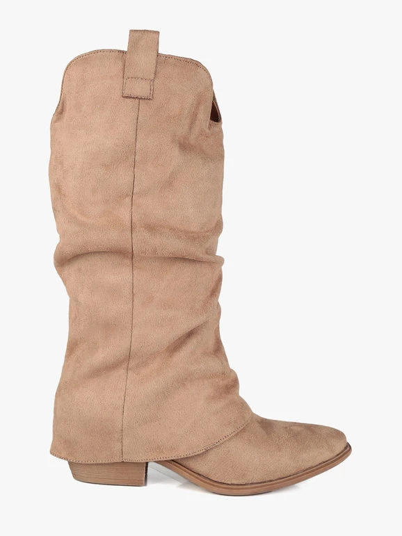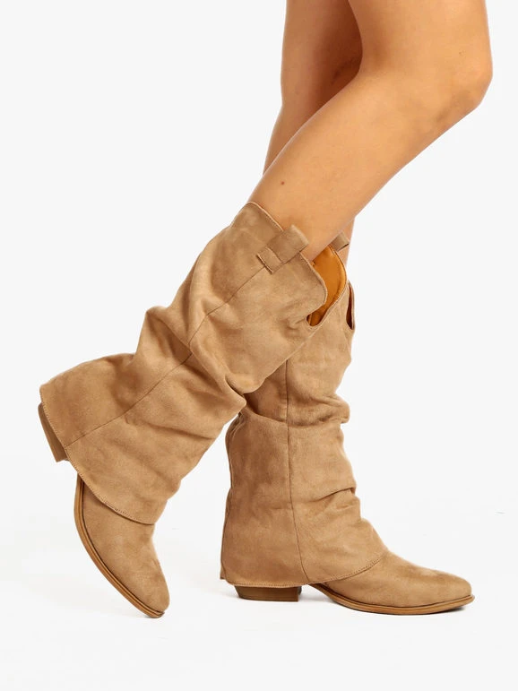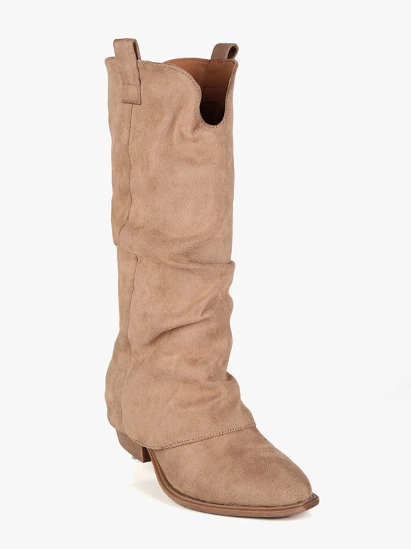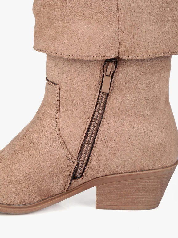 Stivale donna a punta, tomaia in tessuto scamosciato, grande risvolto morbido fino al tacco, mezza zip al di sotto del risvolto per facilitare la calzata, interno in tessuto, suola in gomma antiscivolo.