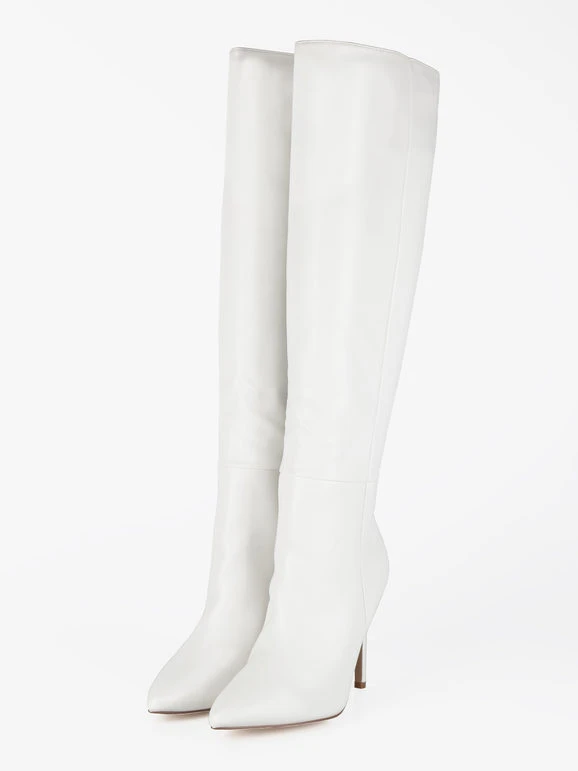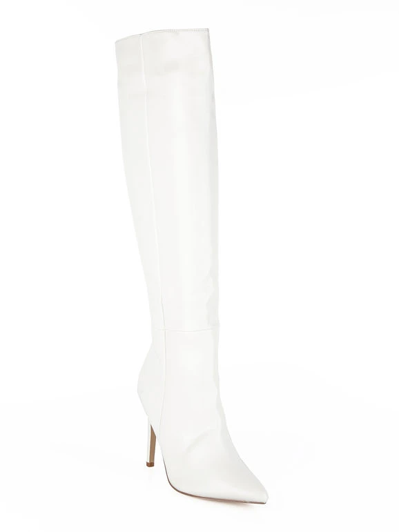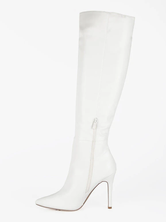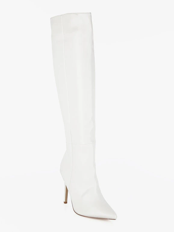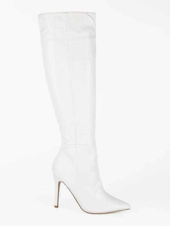 Stivali donna con tomaia in ecopelle, interno in ecopelle, tacco alto 11 cm, suola in gomma, chiusura zip su lato interno.