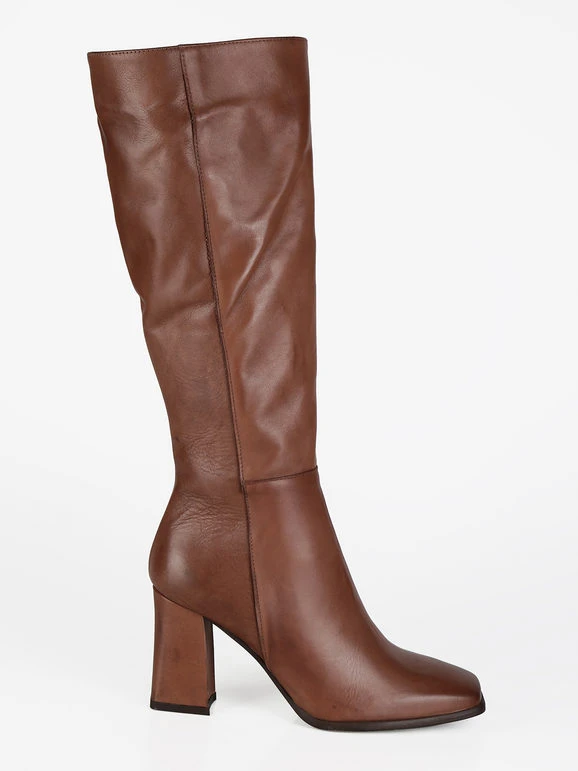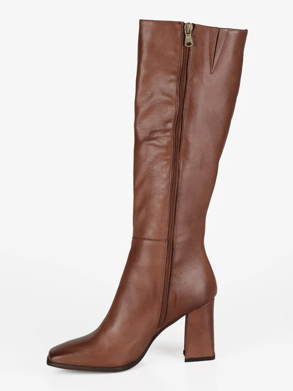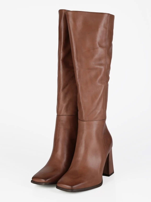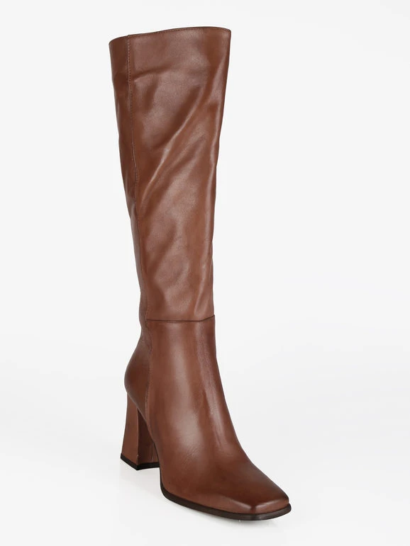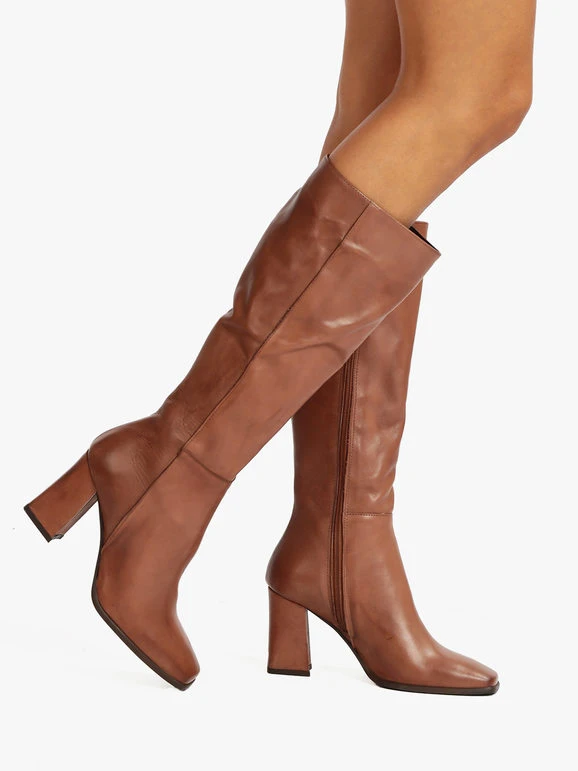 Stivali donna a punta squadrata con tomaia in pelle, interno in pelle, suola in gomma resistente, tacco largo , cuciture a vista, cerniera su lato interno