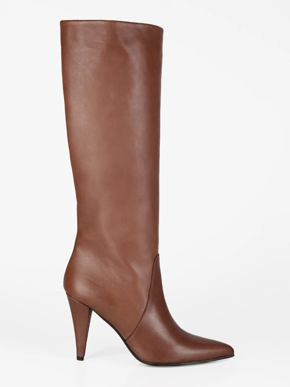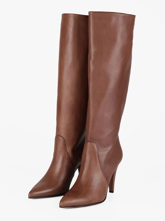 Stivali donna con tomaia in pelle, interno in pelle, tacco alto 10 cm, suola in gomma sintetica.