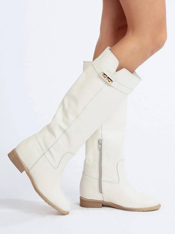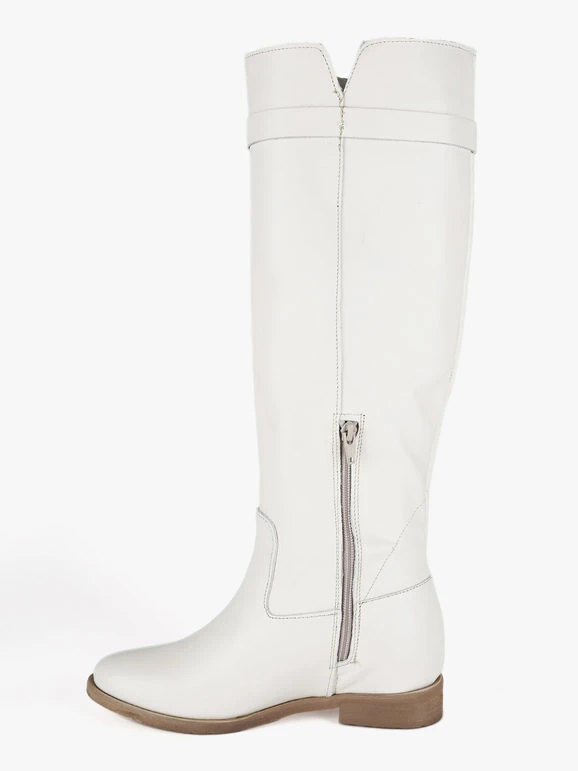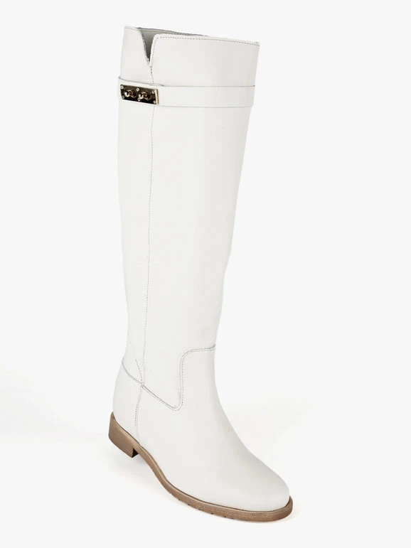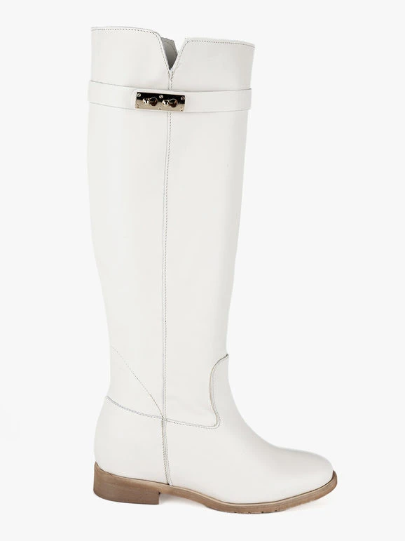 Stivali donna con tomaia in pelle, cinturino con fibbia sulla parte alta, interno scamosciato, mezza zip sul lato interno.
