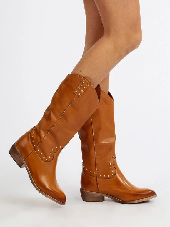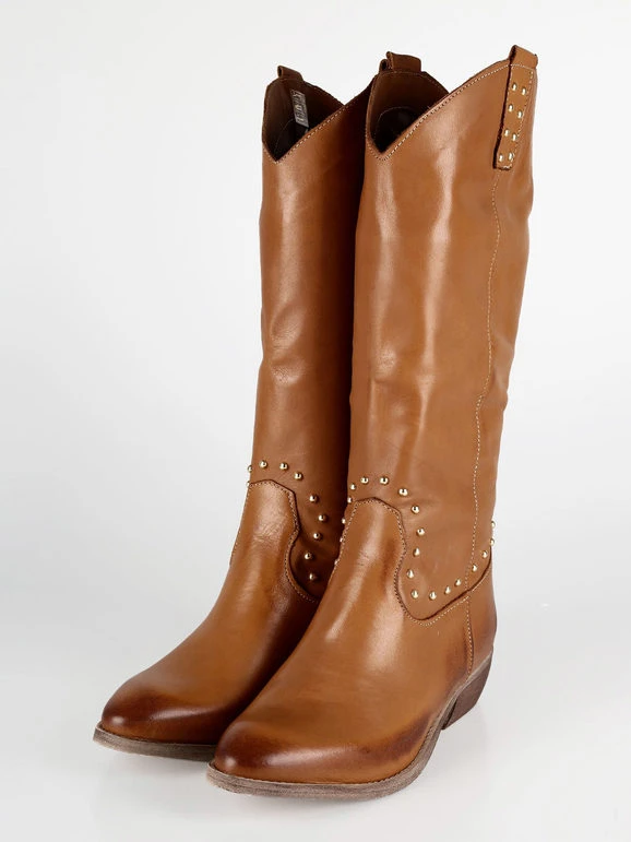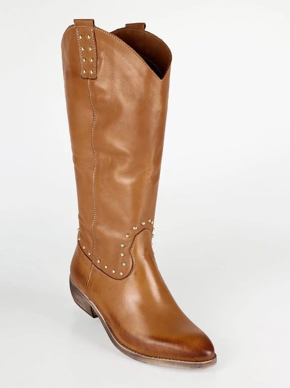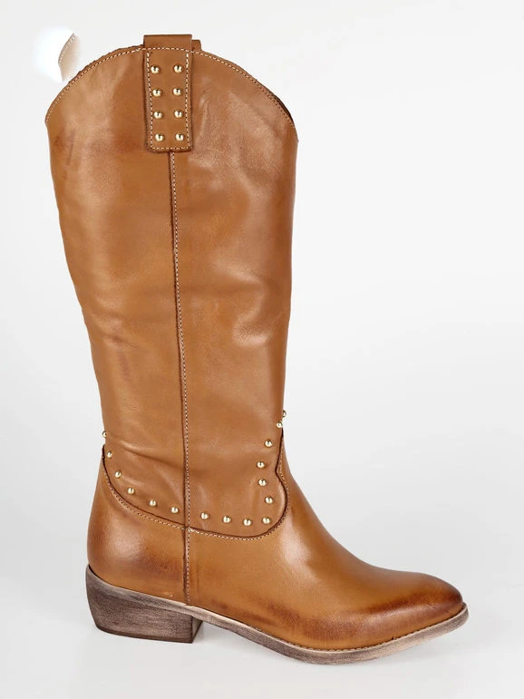 Stivali donna con tomaia in pelle, borchie decorative, suola liscia in gomma.
