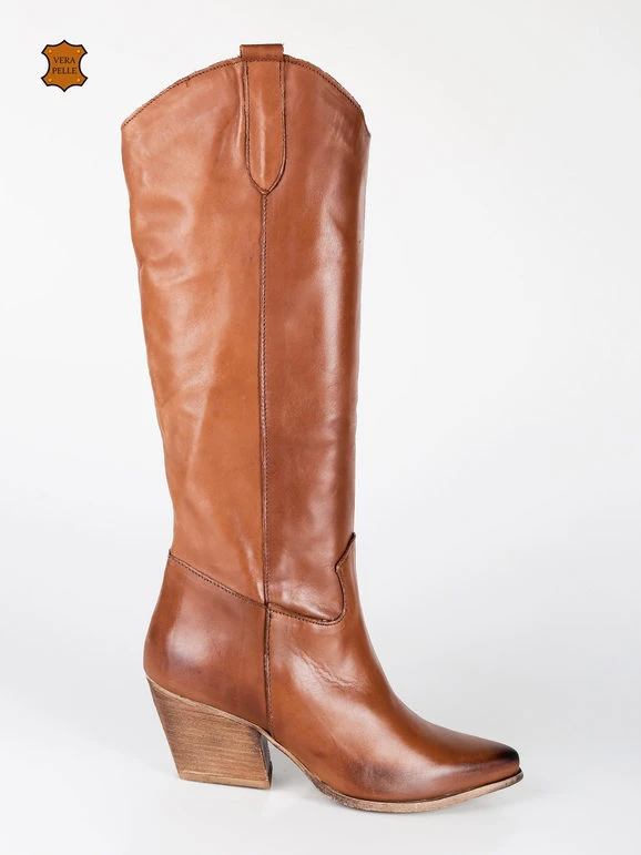 Stivali donna modello texano con tomaia in pelle, plantare in pelle, suola in gomma sintetica. Nel N.38 la soletta interna è di 24.5 cm circa