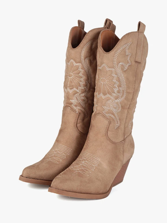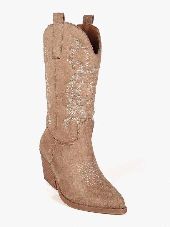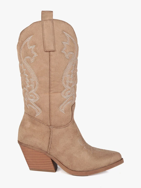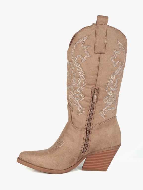 Stivali modello texano da donna, tomaia in tessuto scamosciato, trama lavorata con cuciture decorative, mezza zip laterale nella parte interna per facilitare la calzata, interno foderato in tessuto, soletta interna in ecopelle, tacco alto 6 cm, suola antiscivolo.