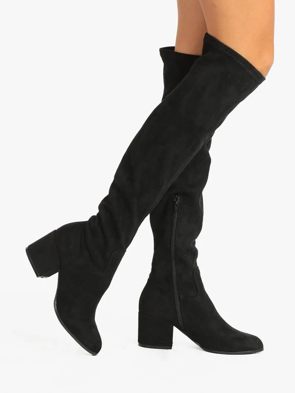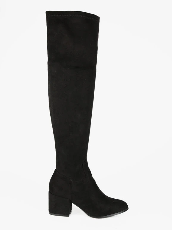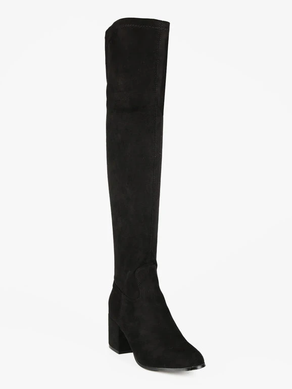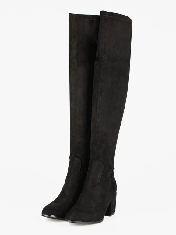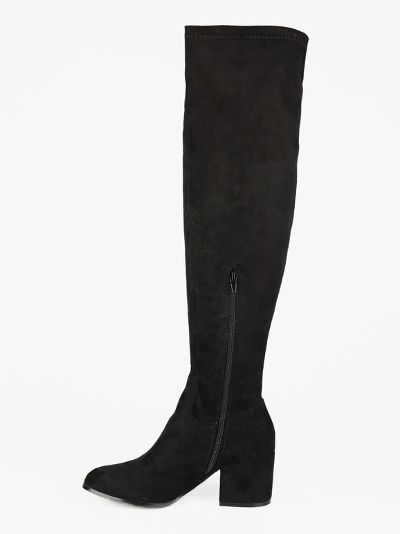 Stivali alti da donna con tacco, modello cuissardes, tomaia in ecopelle scamosciata, gambale morbido, mezza zip sul lato interno, cuciture a vista, tacco alto 6,5 cm, interno in tessuto, suola in gomma antiscivolo.