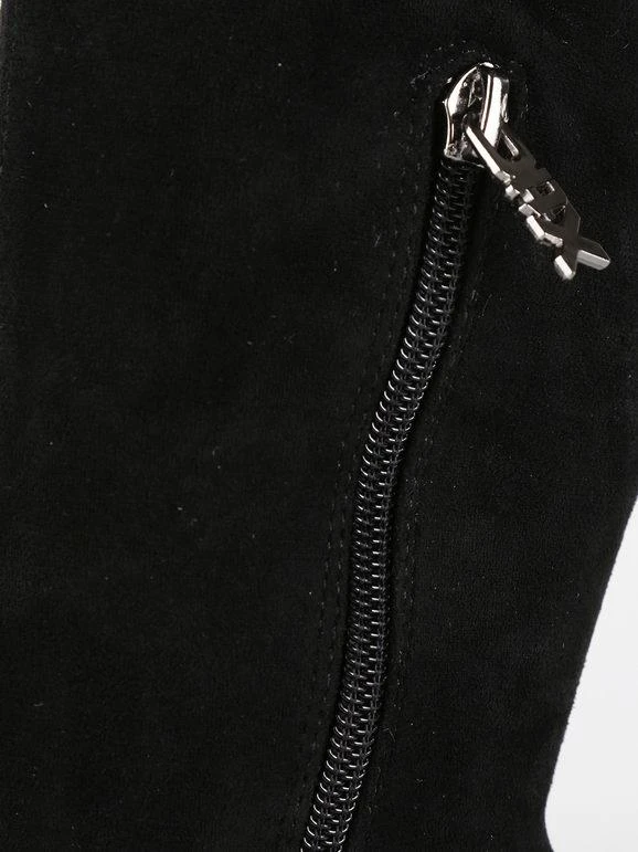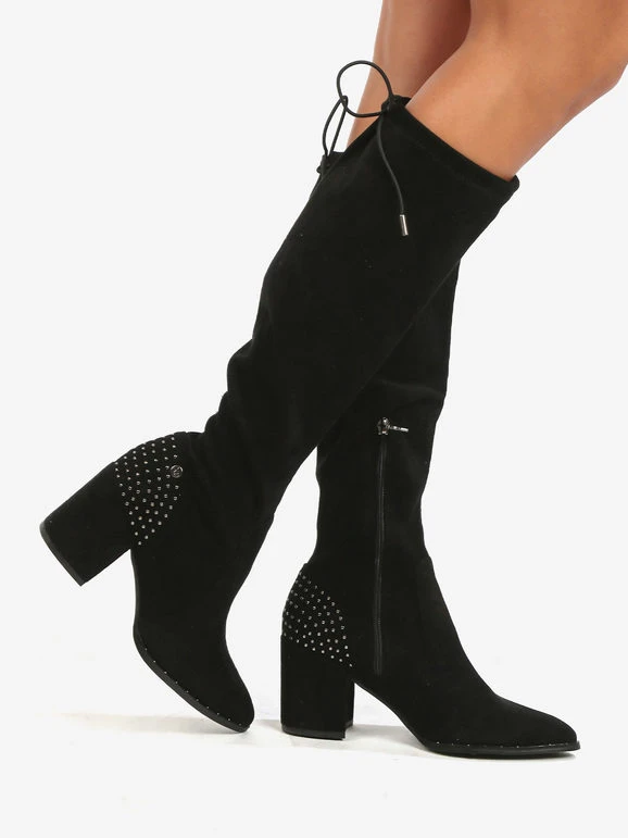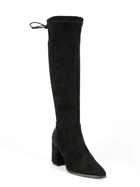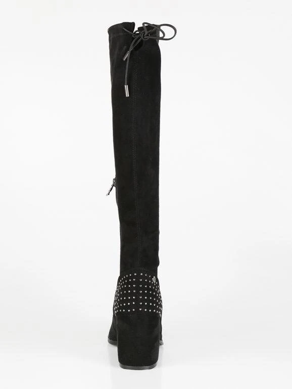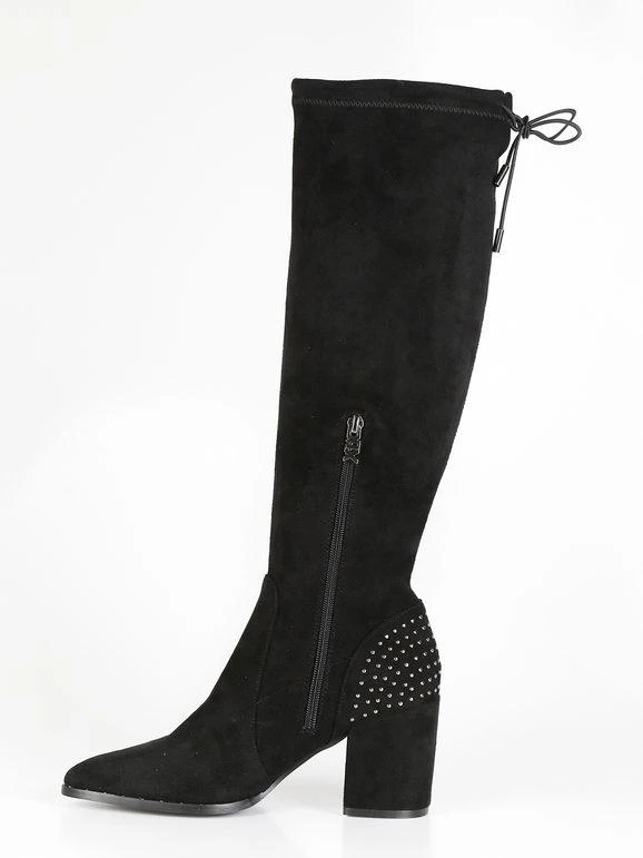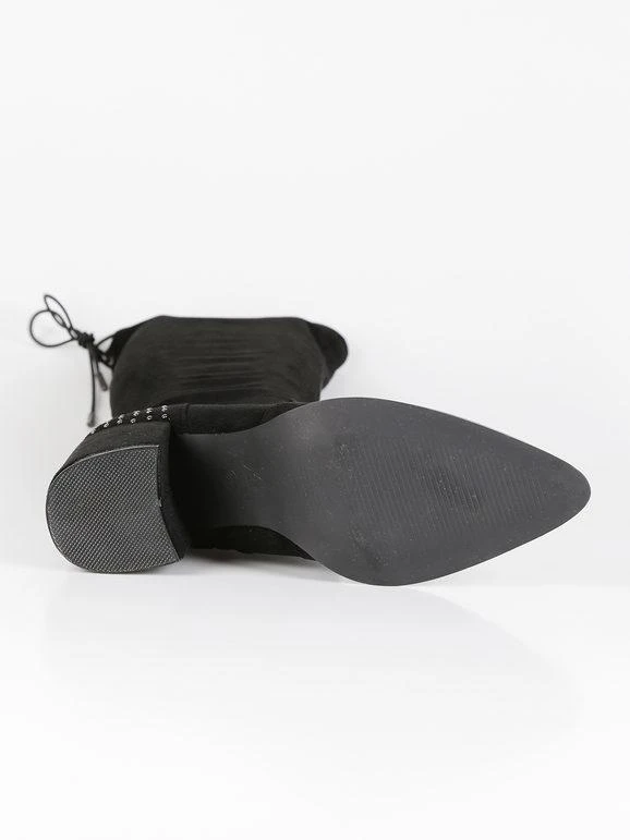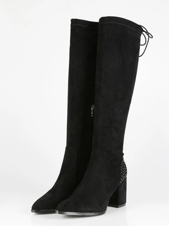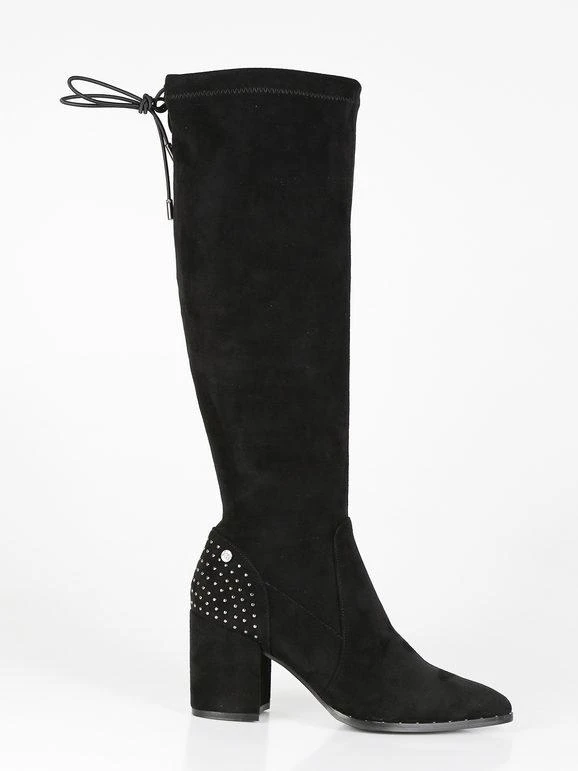 Stivali alti donna con tomaia in tessuto scamosciato, dettagli borchie sul retro, interno in tessuto, laccetti regolabili sul retro, soletta interna in ecopelle, suola in gomma, tacco largo alto 8 cm, gambale alto 42 cm. Nel N.38 la soletta interna è di 22 cm circa