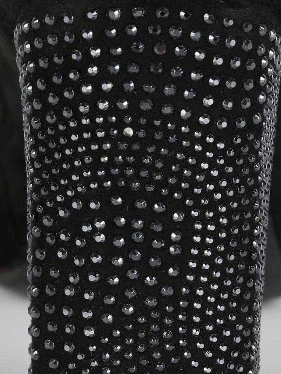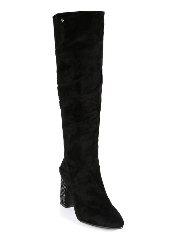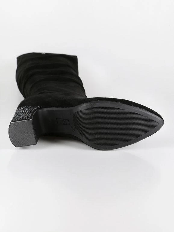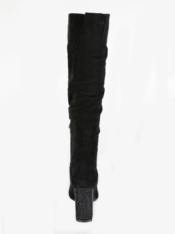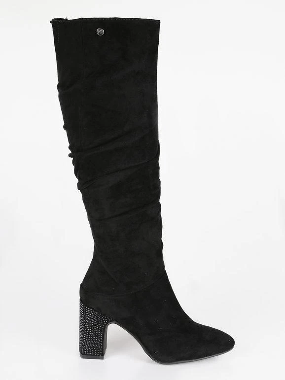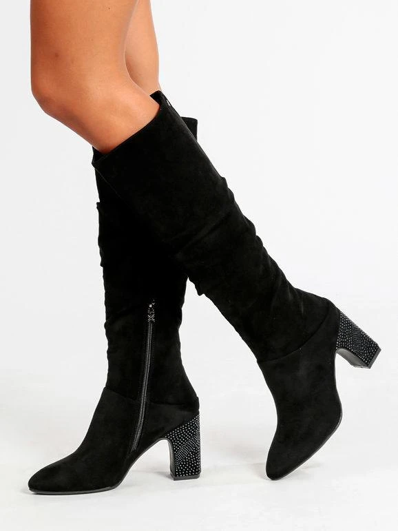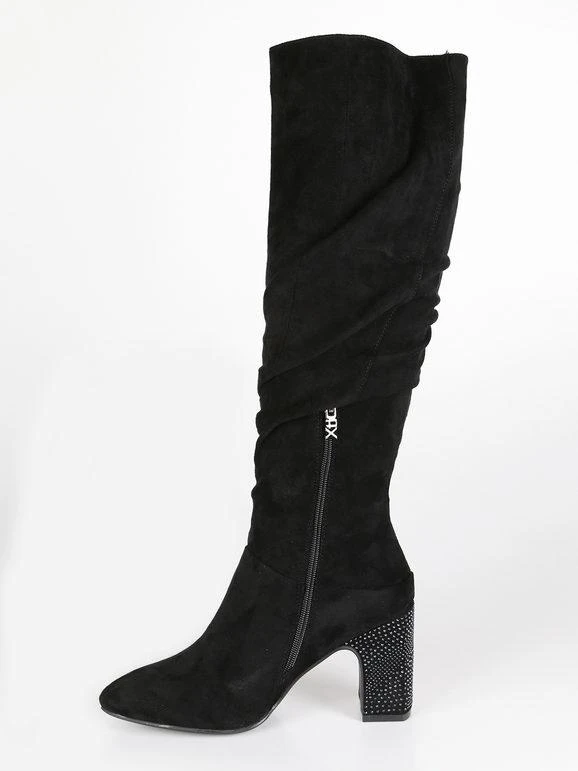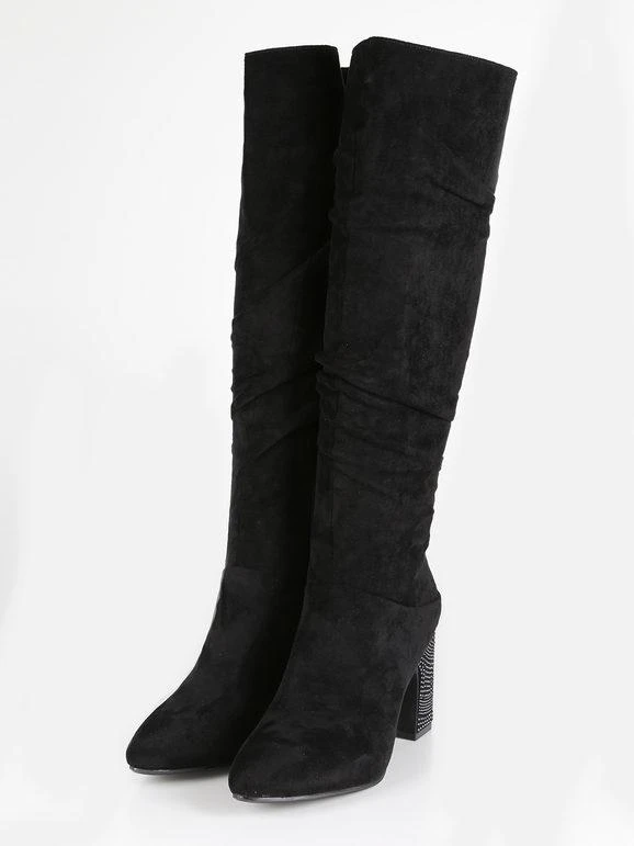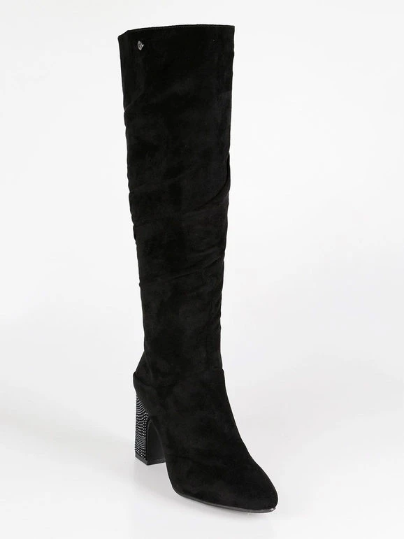 Stivali donna con tomaia in tessuto scamosciato, interno in tessuto simil scamosciato, cerniera di chiusura sul lato interno, soletta interna in ecopelle, suola in gomma, tacco largo alto 9 cm ricoperto di strass, gambale alto 40 cm. Nel N.38 la soletta interna è di 22 cm circa